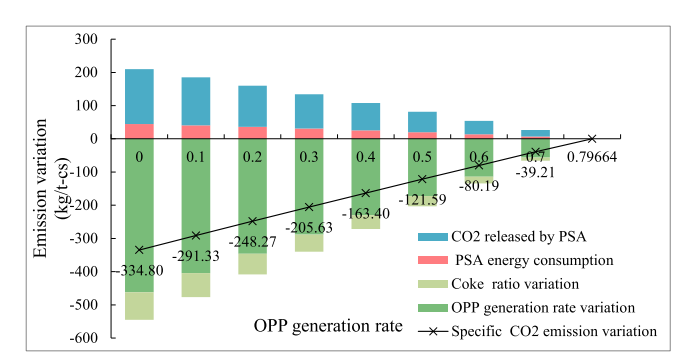如图3所示,随着OPP生成速率的降低,比CO2排放量显著降低。当OPP发电率降低为零时,其效果包括:用电结构的变化使比CO2排放量减少462.33 kg/t-cs;PSA释放的二氧化碳是PSA的废气。如果没有经济有效的二氧化碳储存技术,分离出来的二氧化碳就会被释放到大气中。“PSA能耗”是指PSA所消耗的电能。BFG净化耗电量为52.80 kW h/t-cs,增加排放44.60 kg/tcs;焦炭比的变化是由于高炉中BFG的回收,减少了焦炭的消耗。与A企业不同,B企业以购电为主(占83.73%)。但是由于效率低,企业B的OPP仍然消耗了大部分BFG。计算表明,不生产OPP后,B企业的比CO2排放量减少了171.07 kg/t-cs(这是用电量结构变化、BFG净化用电量和BFG回收利用的综合效应)。对于中国的ISMs来说,使用购买的电力就是减少排放。对于中国产电率较高的ISMs,使用购买的电力成本更高。因此,提高OPP效率和废能回收率更具有现实意义。对于像B企业这样发电机组规模小、效率较低的ISMs,改用全购电绝对是最好的选择。