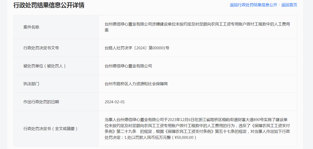 近日,据浙江行政处罚通报显示:台州德信绿心置业有限公司因未按约定及时足额向农民工工资专用账户拨付工程款,被处以5万元罚款。