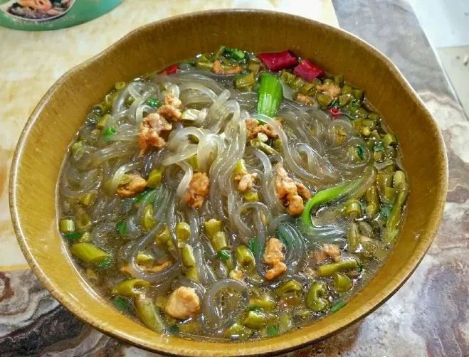 酸豆角肉丝汤珍珠粉、玉米条
