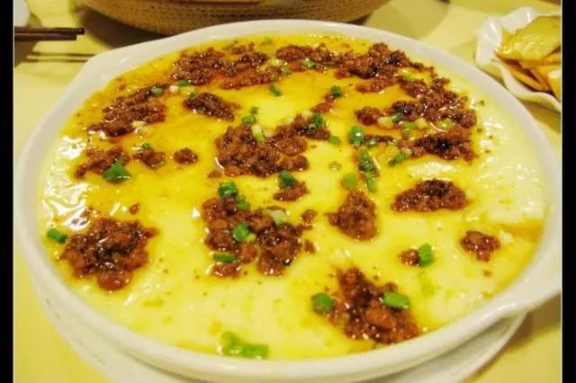 肉沫蒸水蛋、玉米红萝卜炒火腿