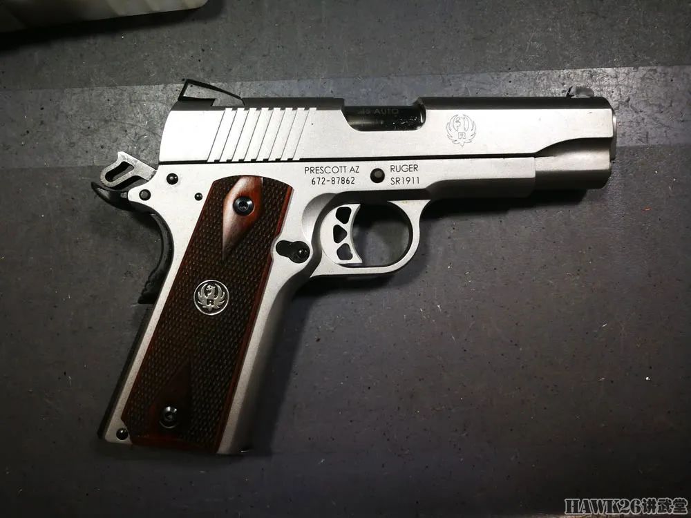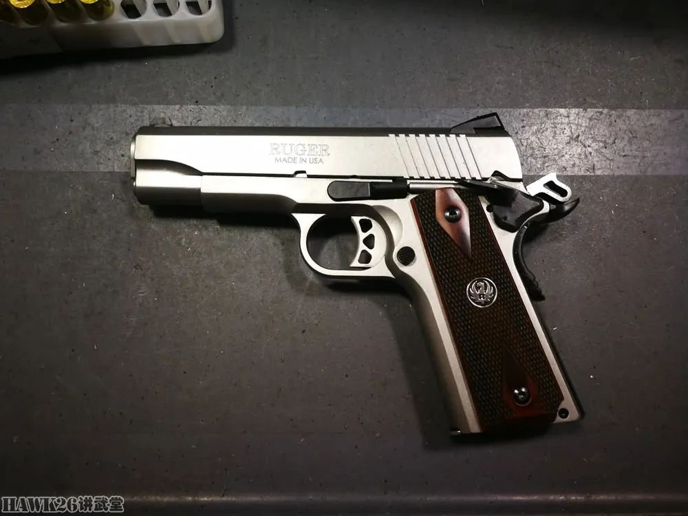 最后多说几句吧。这是本人2018年1月在美国打过的一支鲁格1911军官型手枪,该枪口径.45 ACP。除银色外观外,部分操作部件采用黑色,达到撞色效果。击锤、手动保险、握把保险、瞄准具都进行了改进。套筒倾斜的防滑纹路更宽更深,这是根据现在的设计风格做出的改进。