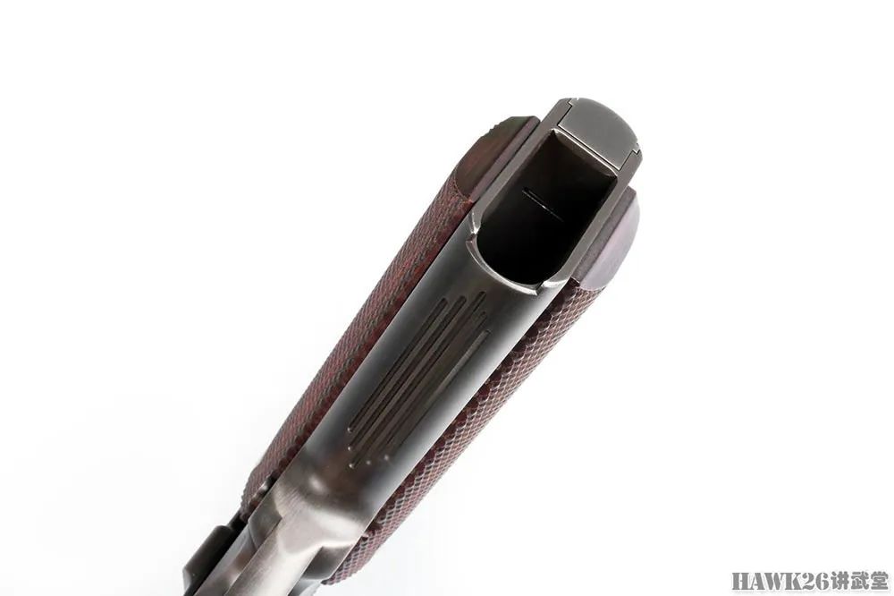 照门同样采用了复古设计,但高度较高,并有横向的纹路,防止产生虚光影响瞄准。完全机械加工的击锤比较小,更有古典美感。