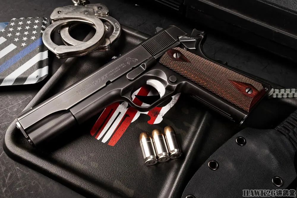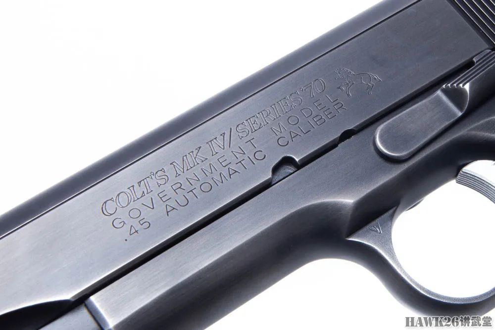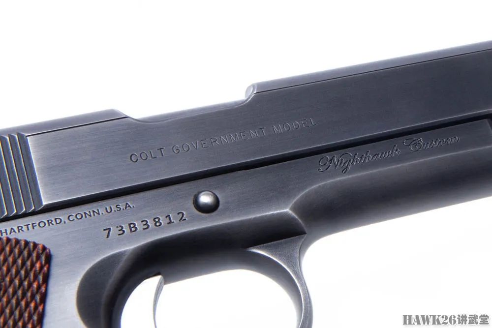 套筒上有柯尔特政府型的铭文,套筒座上有夜鹰定制公司的名称,两种不同的字体,显示出时代的进步。