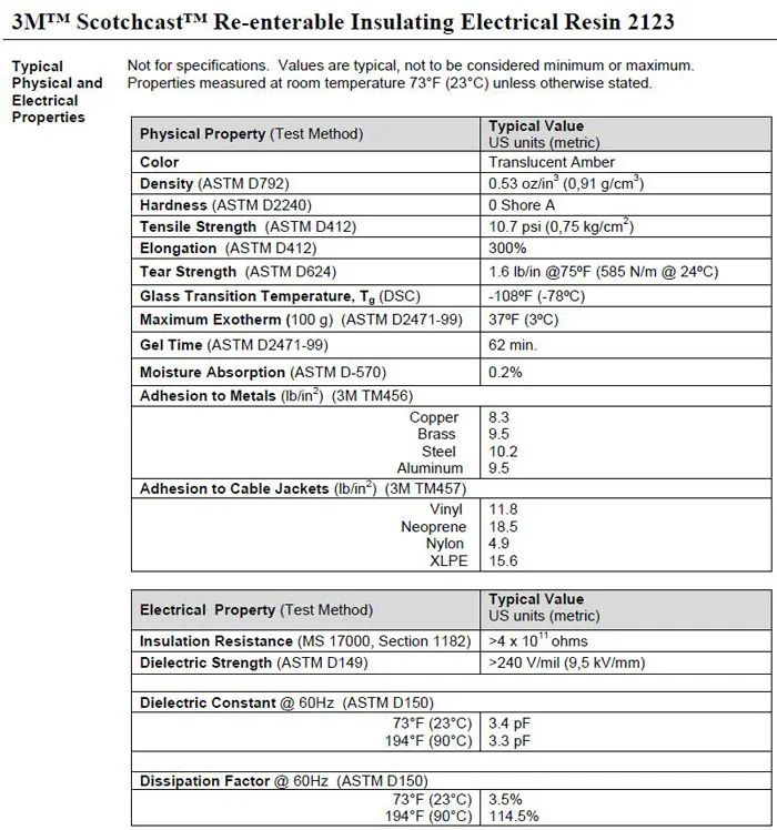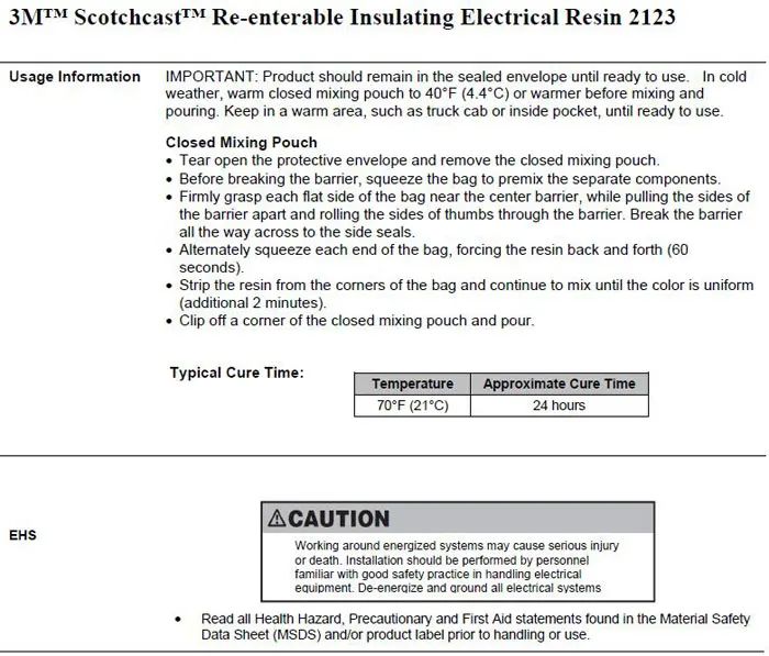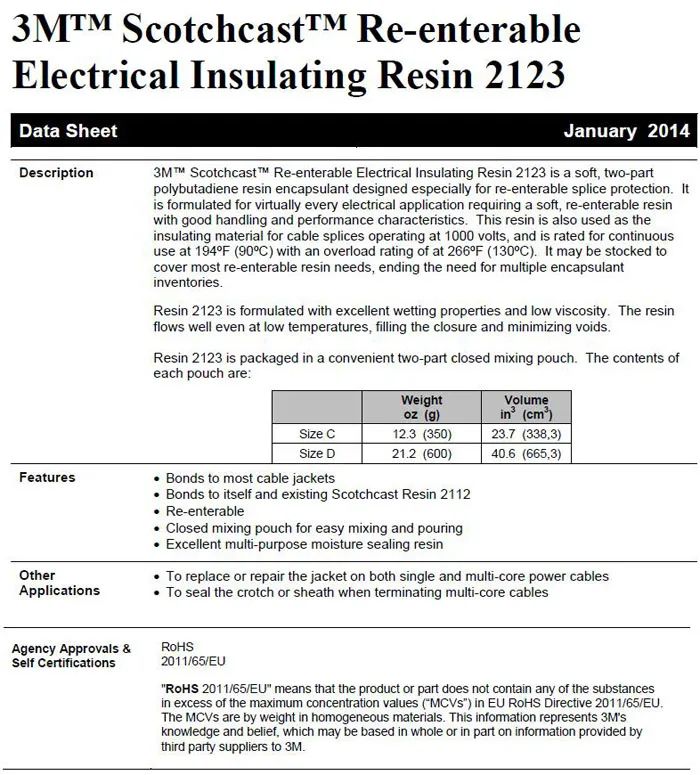 3M™ Scotchcast™ 2123电气树脂是一种柔软的双组分聚丁二烯树脂密封剂。
