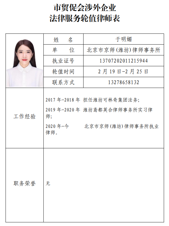 为给广大会员企业提供更为高效、便捷的法律服务,由潍坊国际商会组建的涉外法律专委会选派专业律师团队,按照指定时间轮岗值班,公布咨询电话及邮箱,为广大企业提供常见法律咨询服务,协助处理相关法律事务。拟提供如下法律服务事项: