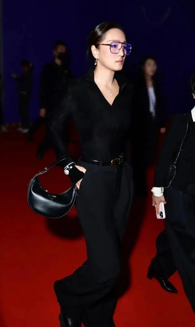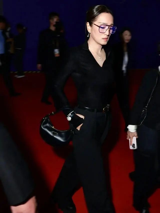 这身黑衣造型看似简单,实则蕴含了巩俐对服饰艺术的理解和运用。黑色的上衣采用了紧身的款式设计,完美地勾勒出了巩俐健美的身材线条,展示了她多年保持的良好身材。紧身上衣的贴合设计,不仅凸显了她的曼妙身姿,更是透露出一种不经意的性感魅力。搭配的下装是一条阔腿长裤,这种款式的裤子可以很好地修饰腿型,让双腿看起来更加笔直和修长。阔腿的设计也为巩俐增添了一丝从容和大气,使得她的整体造型更加和谐统一。长裤的宽松度恰到好处,既不失优雅,又增添了一丝休闲的韵味,让巩俐在保持端庄的同时,也展现出随性的风采。