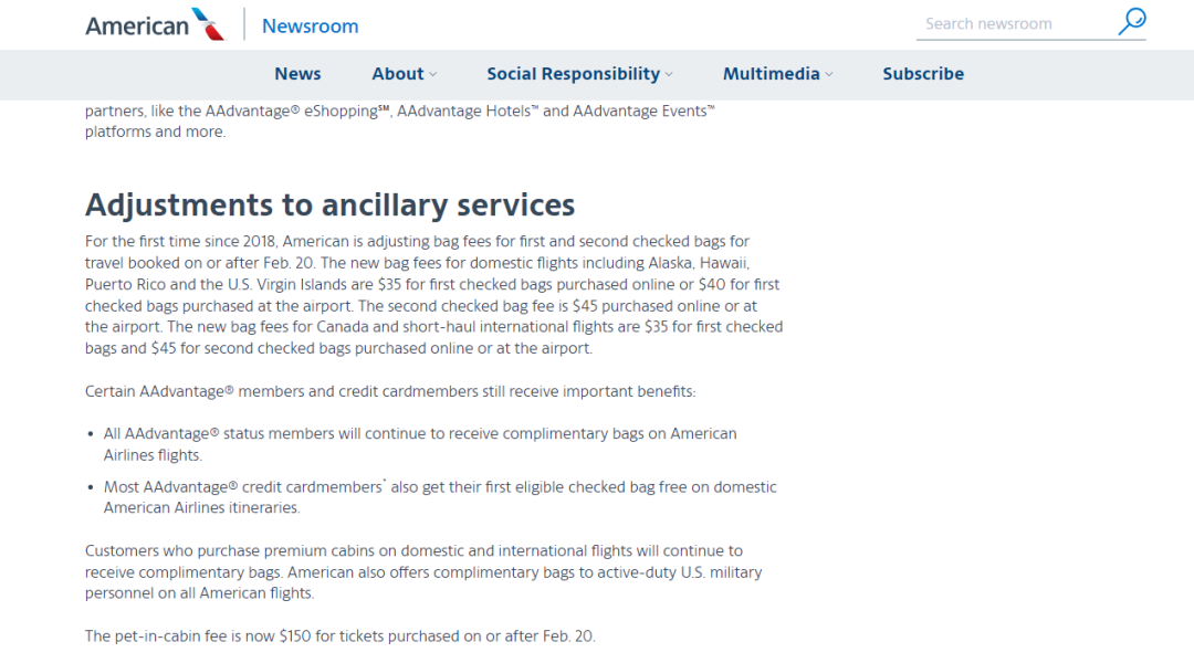 美国航空最大的竞争对手,达美航空(Delta Air Lines)和美联航(United Airlines),在类似的航线上,第一件托运行李收费30美元,第二件托运行李收费40美元。此次提价之际,航空公司正面临燃油和劳动力成本上涨的挑战。美国航空在上个月的财报中披露,其2023年最后三个月的净利润暴跌了98%。美国航空公司从这些行李费用中赚了很多钱。根据美国运输统计局(Bureau of Transportation Statistics)的最新数据,在2022年,他们从行李费中赚了创新高的68亿美元。