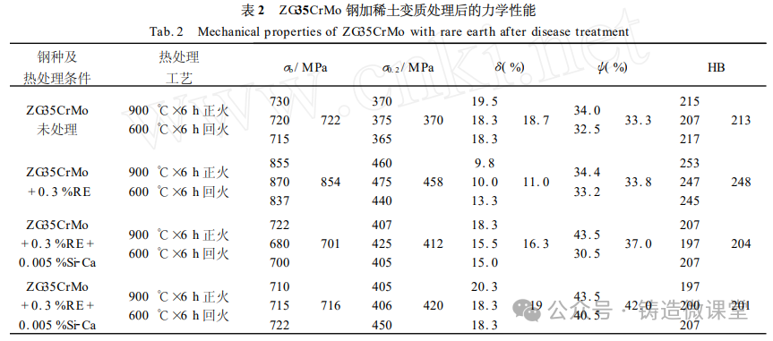 从表中可以看出,经过变质处理的钢液,力学性能有明显提高,强度提高11%以上,而采用RE-Ca复合处理综合性能更好,冲击韧度提高26%左右。