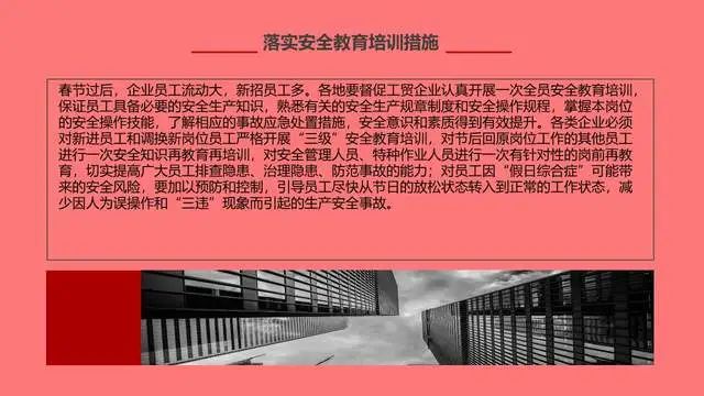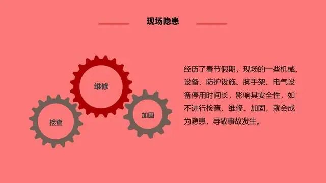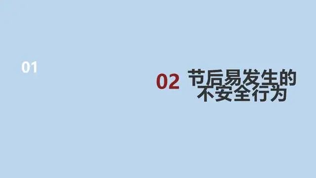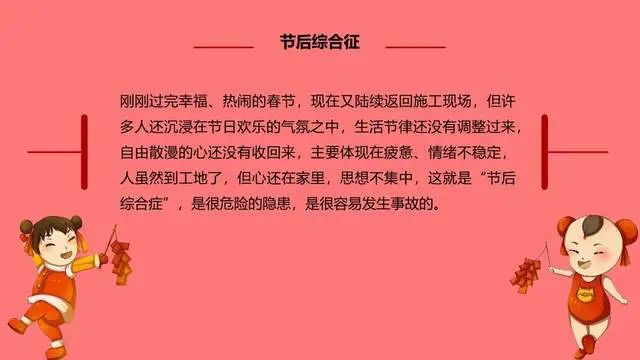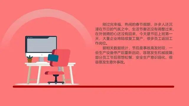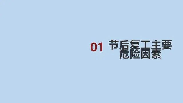 据相关数据统计,节后是事故高发时段,一些生产设备停产后重新启动,容易发生机械故障部分员工节后思想松懈,安全生产意识弱化,很容易发生意外事故。