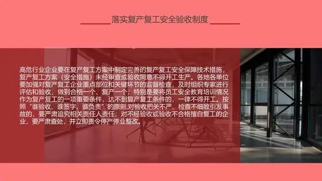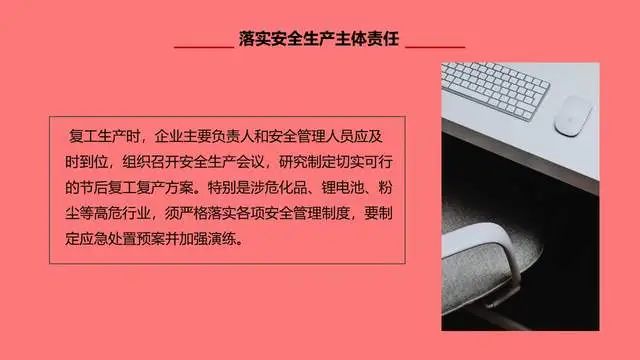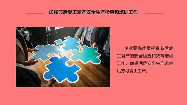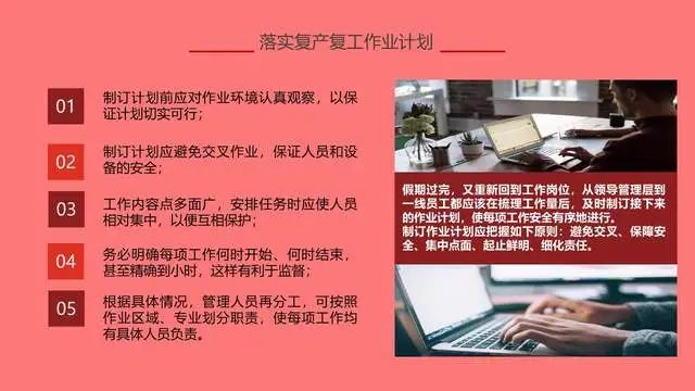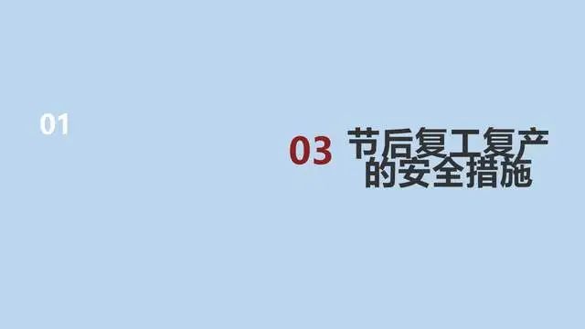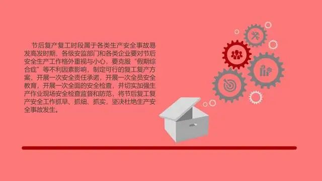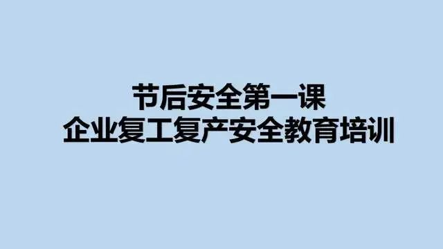 节后复产复工时段属于各类生产安全事故易发高发时期,各级安监部门和各类企业要对节后安全生产工作格外重视与小心,要克服“假期综合症”等不利因素影响,制定可行的复工复产方案,开展一次安全责任承诺,开展一次全员安全教育,开展一次全面的安全检查,并切实加强生产作业现场安全检查监督和防范,将节后复工复产安全工作抓早、抓细、抓实,坚决杜绝生产安全事故发生。
