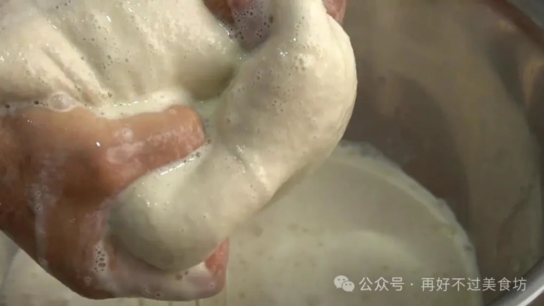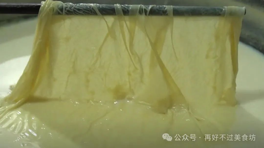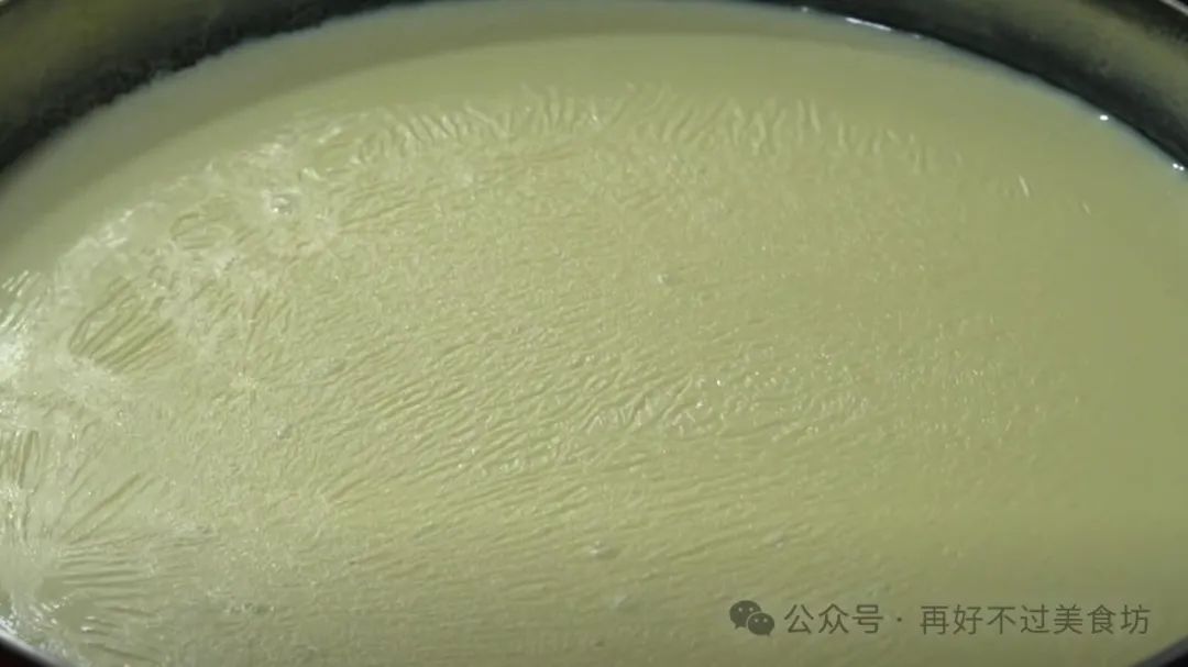 8、每取完一层就继续开火,把豆汁加热到微开的状态,然后用勺子搅拌几下,继续关火,重复刚才的步骤,等个3-4分钟,再取下一张,500克黄豆大约能取30张左右。