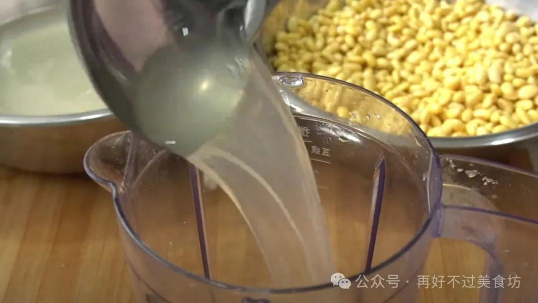 2、准备一个料理机或者豆浆机,按照三勺水、一勺黄豆的比例加到里面,水直接淹没过黄豆即可,然后打成细腻的豆汁。