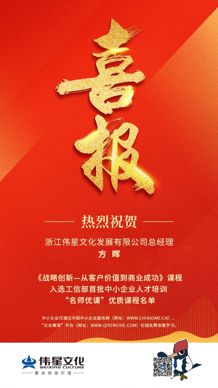 1月17日,工业和信息化部公布50门优质课程名单,浙江伟星文化发展有限公司总经理方晖的《战略创新—从客户价值到商业成功》课程入选其中。此次工业和信息化部组织开展首次全国中小企业人才培训“名师优课”征集遴选活动,经公开征集、各地中小企业主管部门初选、专家评审、企业家评价、公众投票评价等程序,在全国范围确定了50门优质课程。
