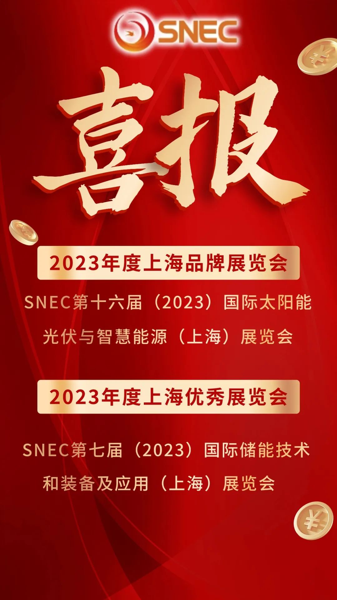 •SNEC第十六届(2023)国际太阳能光伏与智慧能源(上海)光伏展展览会被评为2023年度上海品牌展览会