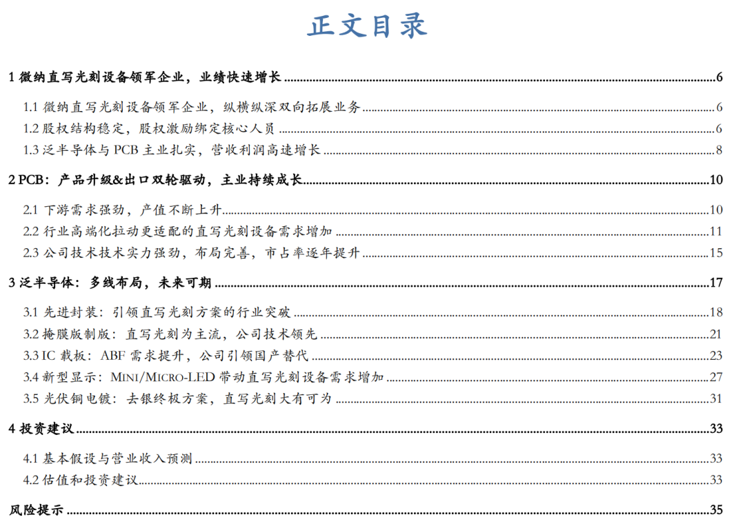 微纳直写光刻设备领军企业,业绩快速增长;PCB:产品升级&出口双轮驱动,主业持续成长;泛半导体:多线布局,未来可期。