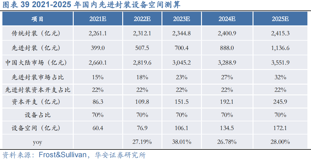 1)根据YOLE的2021年前十大先进封装资本开支的半导体厂商数据,选取其中国内封测厂的2021年的先进封装资本开支/先进封装营收均值22%,作为先进封装资本开支占比;