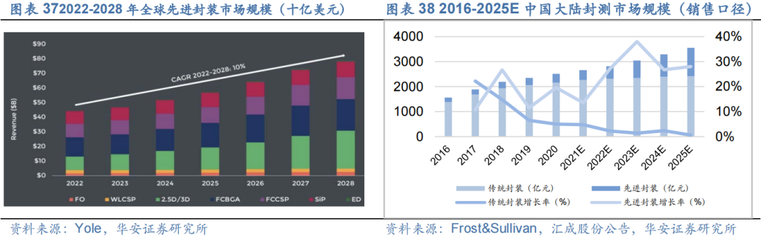 先进封装空间广阔。据YoleGroup,全球先进封装市场规模将由2022年的443亿美元,增长到2028年的786亿美元,年复合成长率(CAGR)为10%。而其中,2.5D/3D先进封装市场收入规模年复合增长率近40%,在先进封装多个细分领域中位列第一。根据Frost&Sullivan数据,中国大陆封测市场2022年507.5亿元,我们结合Yole数据测算占世界比例16%。中国大陆封测市场预计将保持增长,在2025年达到3,551.9亿元的市场规模,其中先进封装将以4年29.91%的复合增长率持续高速发展,在2025年达到1,136.6亿元,占中国大陆封测市场比重将达到32.00%,增速远高于传统封装。