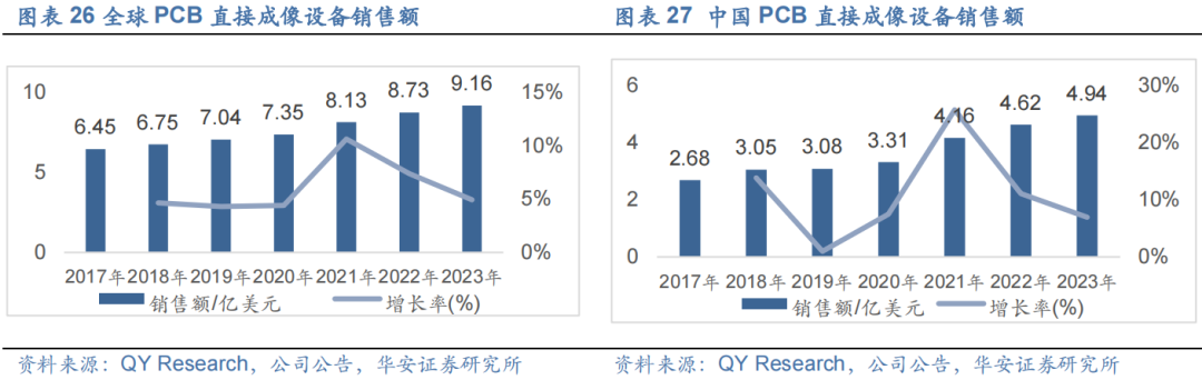 根据 QY Research数据,全球PCB市场直接成像设备产量在2021年为1,148台,销售额为约 8.13亿美元,预计至 2023年,全球 PCB市场直接成像设备产 量将达到 1,588台,销售额将达到约9.16亿美元。伴随着PCB产能向中国大陆地区转移,近年来我国直接成像设备市场规模也快速增长,甚至超过全球增速。根据QY Research数据,中国PCB市场直接成像设备产量在2021年为646台,销售额为约4.16亿美元,预计至2023年,中国PCB市场直接成像设备产量将达到981台,销售额将达约4.94亿美元,6年CAGR达6%。