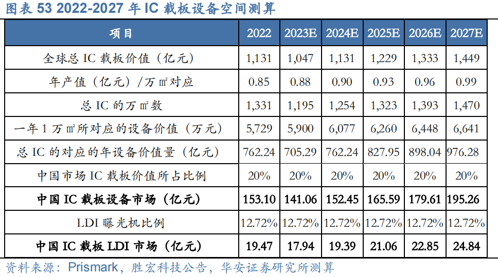 2) 根据胜宏科技公告,预计规划14万㎡IC载板产能,满产后每年营收11.9亿元,其中设备投资8.02亿。由此计算可得,一年1万㎡所对应的营收为0.85亿元,所对应设备为价值量为5,729万元;且LDI曝光设备约占总设备的12.72%。考虑高端载板占比提升带来的产值提升与设备价值量提升,我们进行相应的参数逐年小幅提升假设。
