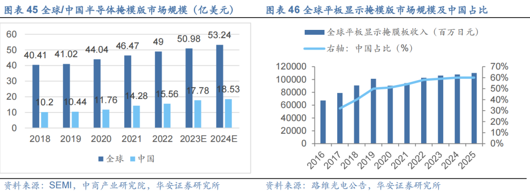 从应用领域来看,半导体芯片和平板显示是主要的两大应用领域,其中半导体芯片占比为60%,平板显示领域占比为28%。据SEMI数据显示,2018-2022年全球半导体掩膜版市场规模由40.41亿美元增长至49亿美元,复合年均增长率达4.9%,预计2024年半导体掩膜版市场规模将继续增长至53.24亿美元,中国市场达到18.53亿美元,占比35%。根据Omdia数据,预计2025年全球平板显示用掩膜版销售收入超过1000亿日元,中国市场占比达60%。