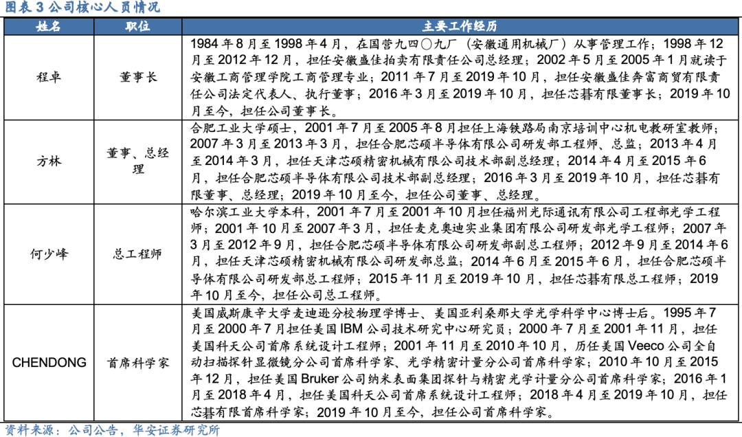 股权结构稳定,核心技术人员技术实力雄厚。实际控制人程卓直接和通过亚歌半导体、合肥纳光刻、合肥合光刻间接持有公司股权比例合计为30.23%,股权结构稳定,话语权强。董事兼总经理方林和总工程师何少锋均具备十几年行业经验,首席科学家CHEN DONG拥有近三十年微纳方面技术研发经验,技术实力强劲。