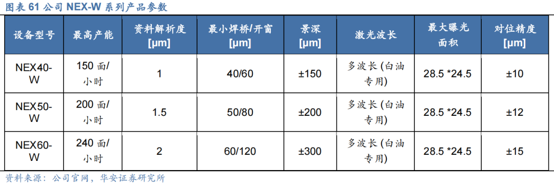 4)新型显示:公司成功实现了满足 Mini-LED 需求的 NEX-W(白油)机型产业化,自主开发的 LDW700设备应用于维信诺,并推动OLED高世代直写光刻设备的产业化。