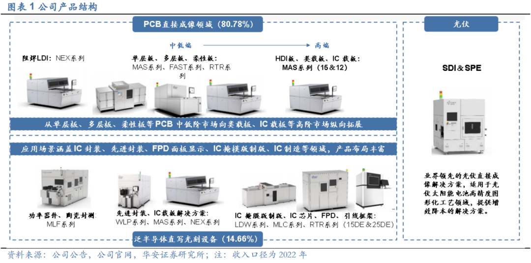 1) PCB 直接成像设备:主要应用于 PCB 制造过程中的线路层及阻焊层曝光环节,业务从单层板、多层板、柔性板等 PCB 中低阶市场向类载板、IC 载板等高阶市场纵向拓展。