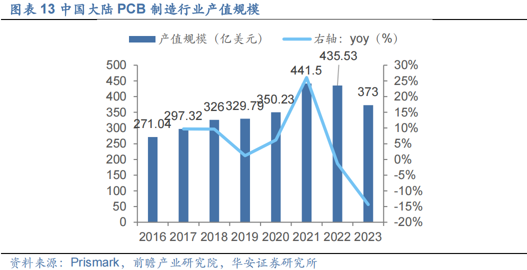 中国大陆PCB产值规模整体呈现逐步上涨的态势,增速波动较为明显。2021年,由于需求复苏、技术要求升级以及原材料价格大幅度上涨等因素影响,推动中国PCB产值强劲增长,中国PCB产值规模达到441.50亿美元,同比增长26.10%。受全球宏观经济波动影响,中国PCB产值2023年预计下滑到373亿美元,Prismark预测到2027年有望成长到468亿美元,cagr5.8%。