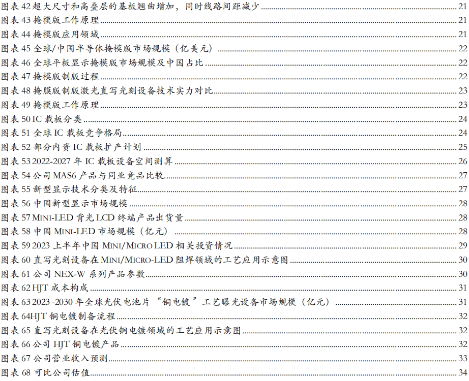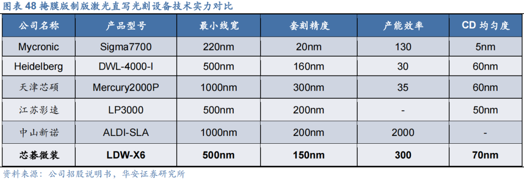 2)掩膜版制版:直写光刻为主流,公司技术领先,LDW系列产品最小解析优于350nm,能够满足线宽130nm-90nm制程节点的掩膜版制版需求。90纳米支撑节点的掩模版制版设备已于2023年首发,在客户端验证。