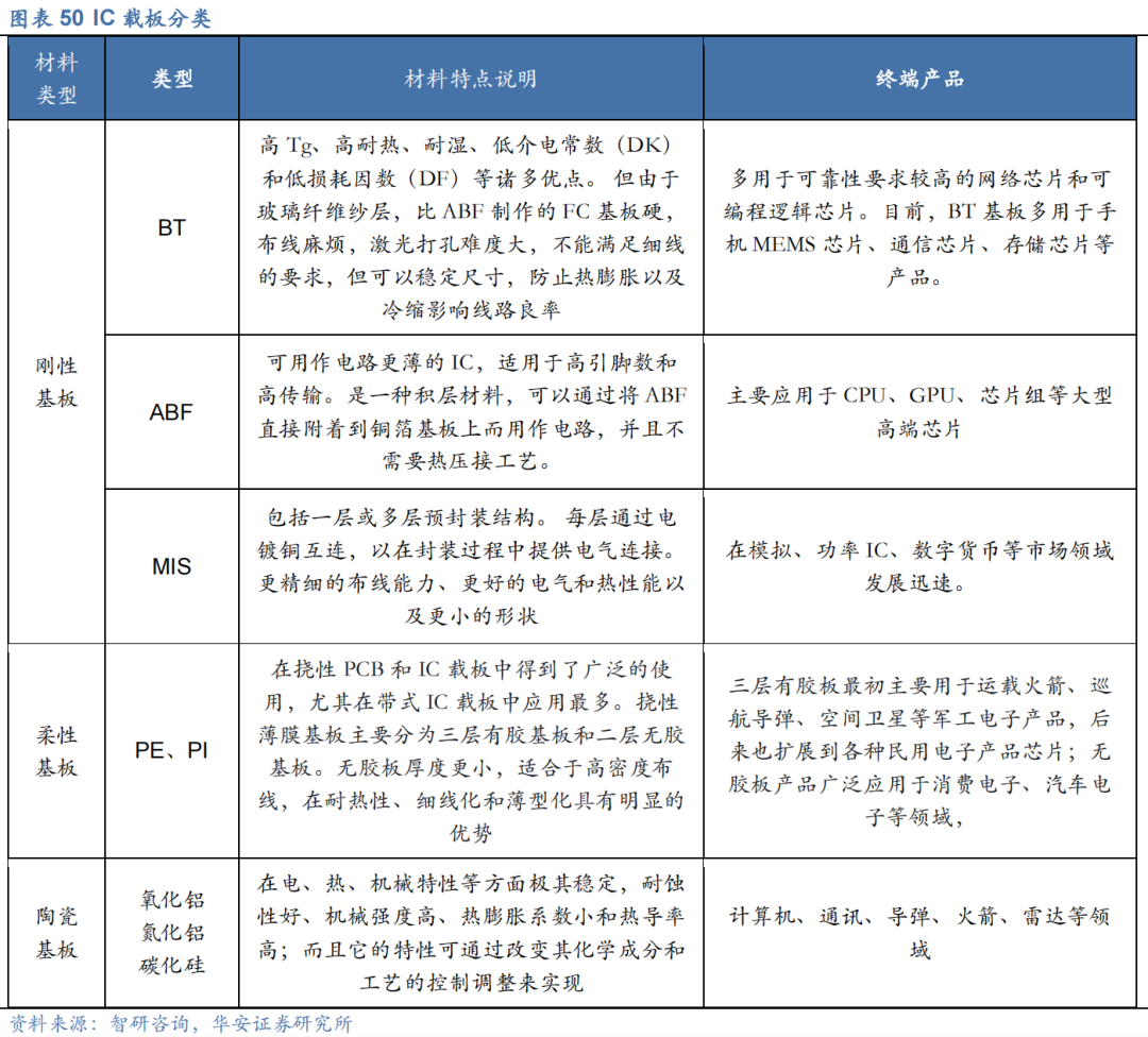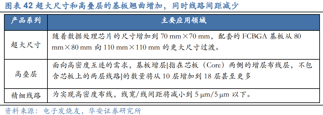 ABF载板是产业发展趋势之一。IC载板按基材广泛使用的是BT和ABF载板,其中ABF载板主要用于CPU、GPU、FPGA、ASIC等高运算性能IC,是FC-BGA封装的标配材料。同时,Chiplet封装技术也大大增加了ABF载板的需求面积,进一步推动了ABF载板需求的提升。