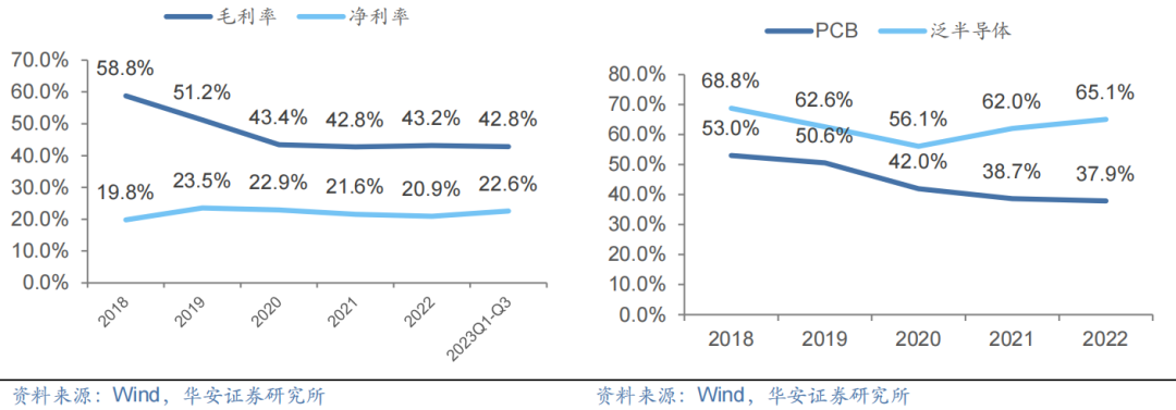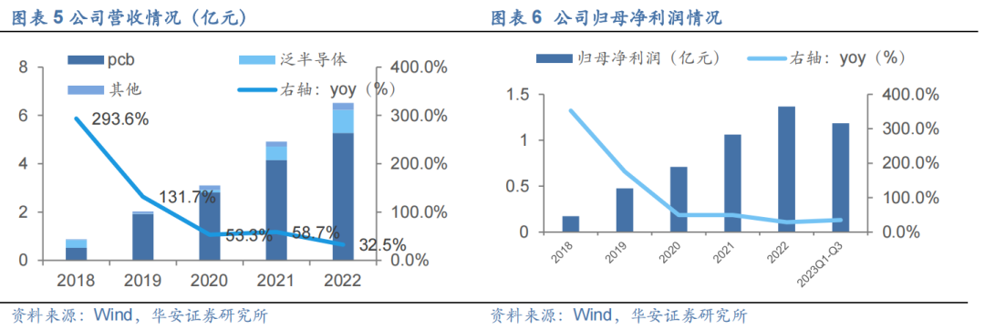 新老业务齐头并进,业绩持续高增。总体来看,2018-2022年,公司营收/归母净利润CAGR分别为65.35/67.7%。2023年Q1-Q3公司实现营收5.24亿元,同比+27.3%;归母净利润1.2亿元,同比+34.9%,继续维持高增速。分产品来看,公司主要收入来源为PCB行业,目前占比稳定在80%以上,但第二大业务泛半导体营收增长迅速,占比有提高的趋势,2022年实现营收0.96亿元,同比+71.4%,未来有望贡献持续增量。