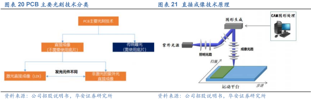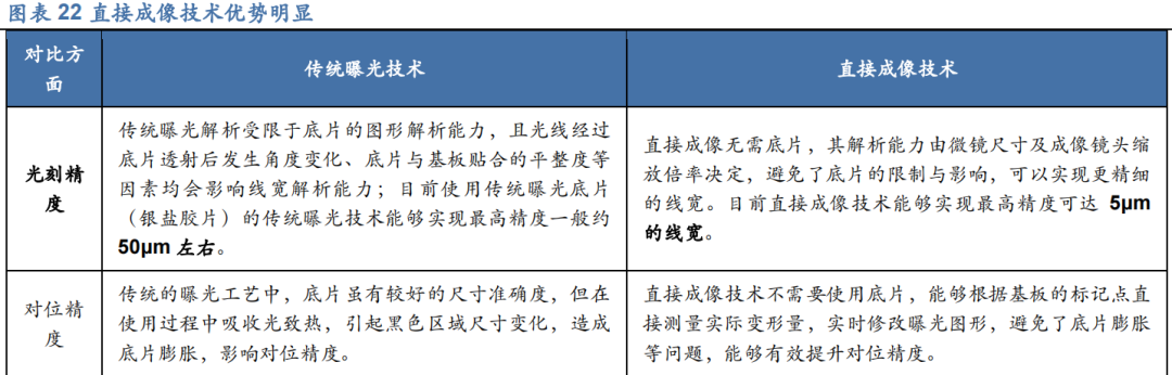 传统曝光设备已无法满足中高端PCB产品需求。中高端PCB产品份额提升带动直接成像设备需求增加。多层板、HDI板、柔性板以及IC载板等中高端PCB产品市场份额占比不断提升,目前已经占据了PCB市场的大部分份额。根据Prismark统计数据,2021年多层板占比全球PCB细分产品的38.6%,封装基板占比为17.6%,柔性版占比为17.5%,HDI版占比为14.7%,单双面板占比为11.6%;台湾电路板协会发布的PCB产业技术蓝图中2019年线宽要求50μm以下的PCB产品占比已经达到了86.10%。目前,直接成像设备在PCB产业化生产中能够实现的最小线宽已经达到5μm,而使用传统曝光底片(银盐胶片)的传统曝光设备能够实现的最小线宽一般约为50μm,无法达到上述中高端PCB产品大规模产业化制造中的曝光精度需求。