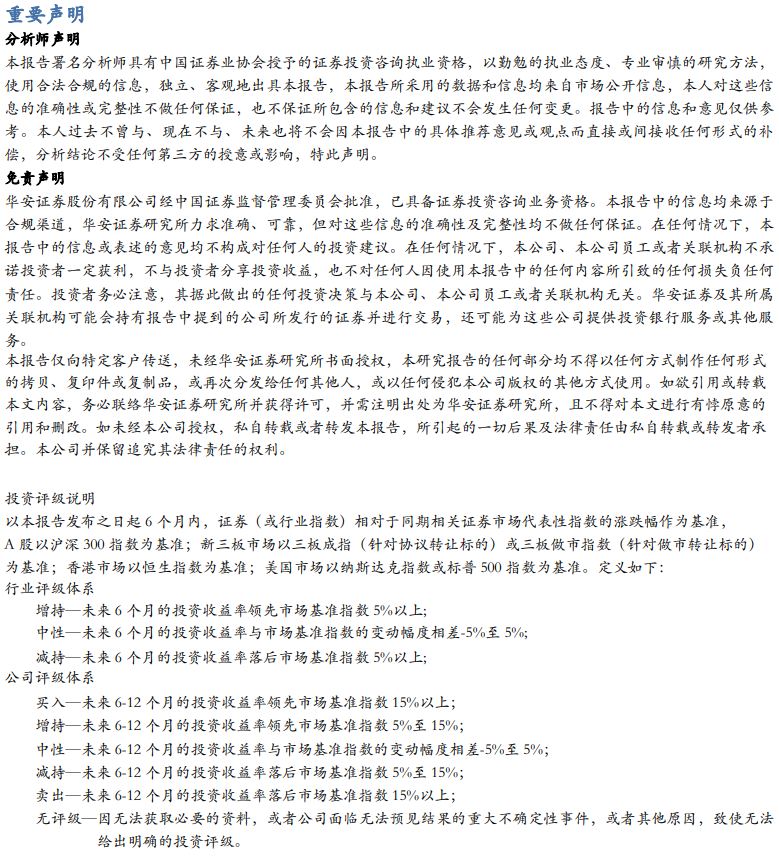 适当性说明:《证券期货投资者适当性管理办法》于2017年7月1日起正式实施,通过本微信订阅号/本账号发布的观点和信息仅供华安证券的专业投资者参考,完整的投资观点应以华安证券研究所发布的完整报告为准。若您并非华安证券客户中的专业投资者,为控制投资风险,请取消订阅、接收或使用本订阅号/本账号中的任何信息。本订阅号/本账号难以设置访问权限,若给您造成不便,敬请谅解。我司不会因为关注、收到或阅读本订阅号/本账号推送内容而视相关人员为客户。市场有风险,投资需谨慎。