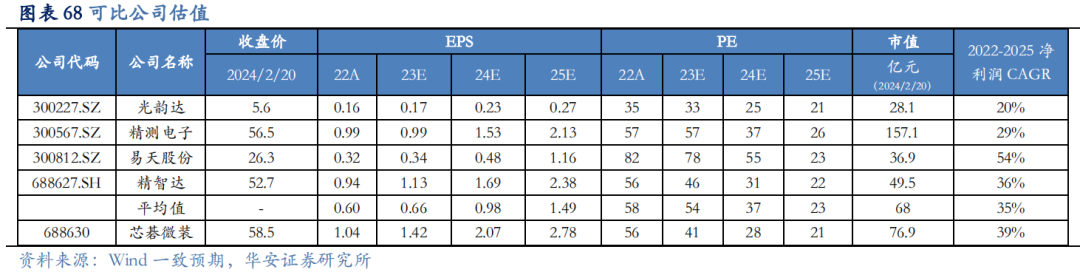 公司当前股价对2023-2025年预测EPS的PE倍数分别为41/28/21倍,我们选取同属“电子专用设备”长江行业分类,且为相关领域公司光韵达、精测电子、易天股份、精智达作为可比公司,考虑到公司作为PCB国产激光曝光设备领军企业,且泛半导体领域拓展带来的成长性,首次覆盖给予“买入”评级。