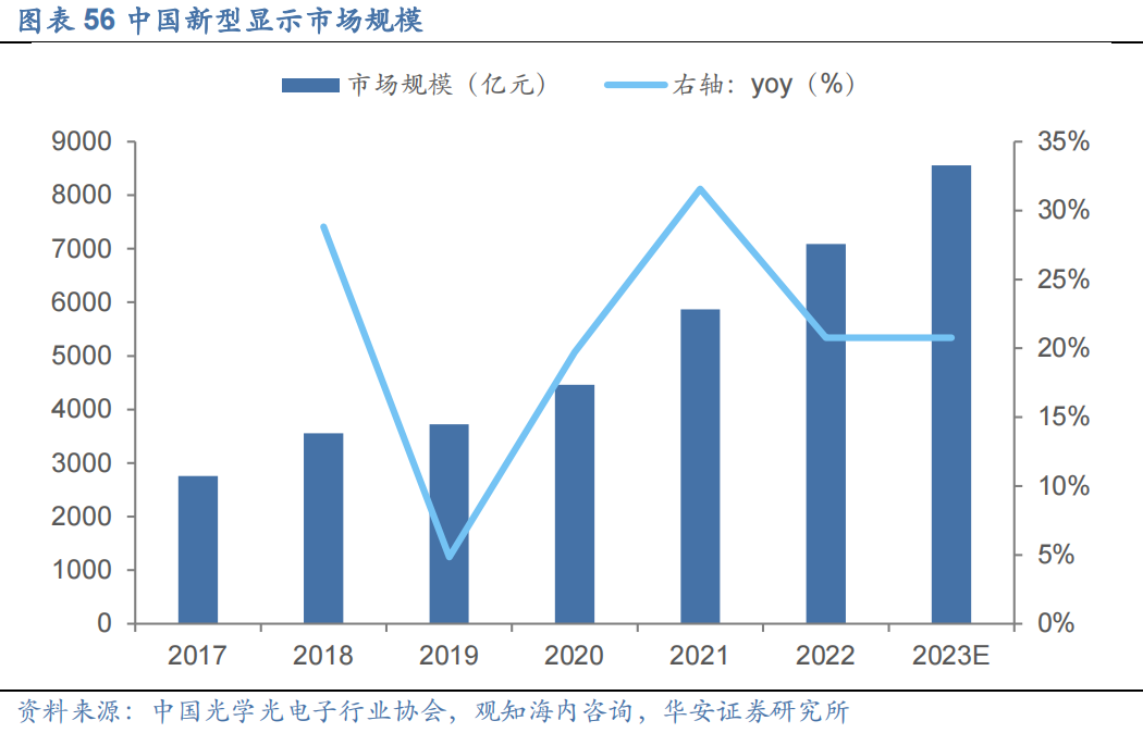 中国新型显示市场规模持续增加。作为最大的面板生产制造基地和研发应用地区,中国已成为全球显示产业发展的重要引擎。中国新型显示产业在过去十多年内,规模持续增长。数据显示,2017-2021年,中国新型显示产业规模从2,758亿元增长至5,868亿元,年均复合增长率达20.77%,预计2023年中国新型显示产业规模将达到8,559亿元。
