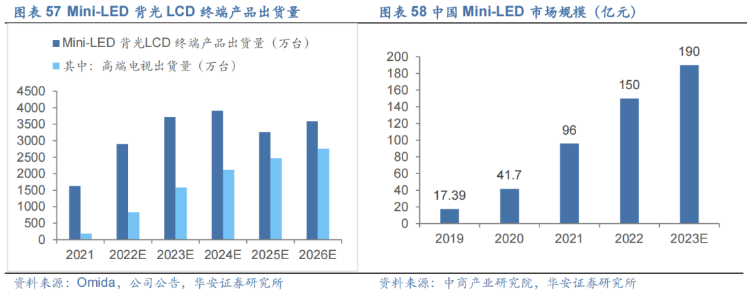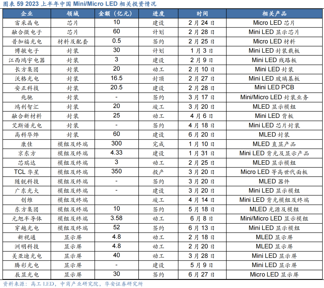 Mini/Micro LED行业空间广阔,投资活跃。根据 Omdia 数据,2021 年 Mini-LED 背光LCD 终端产品出货量约为 1630 万台,预计到 2026 年将增长至 3590 万台,其中高端电视的出货量将由 190 万台增长至 2760 万台, 2023年我国Mini LED市场规模将接近200亿元。作为AR、MR、车显等设备中的核心元件,Mini/Micro LED行业近年来投资市场活跃,据高工LED不完全统计,2023年上半年有关Mini/Micro LED的相关项目达28个,主要集中在封装、模组及终端、显示屏领域等领域。