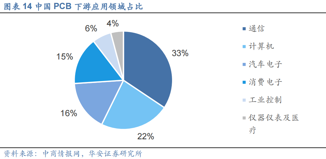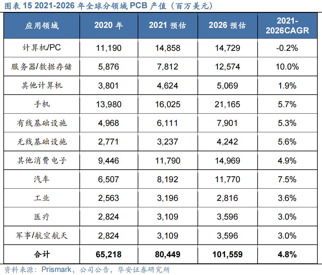 PCB下游应用领域分布较为广泛,通信、计算机占比高,服务器/数据存储增速高。2021年中国PCB下游应用领域占比最高的是通信,达到33%;其次是计算机,占比约为22%;其他下游应用领域PCB市场较大的是汽车电子和消费电子,占比分别为16%和15%。根据Prismark预测,2021-2026年服务器/数据存储、汽车产业、手机、通信板块对PCB需求呈现高增长态势。