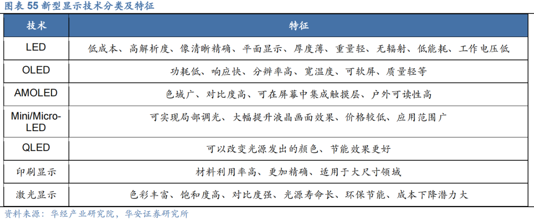 新型显示泛指LCD(液晶显示器)、高世代 OLED(有机发光二极管)、AMOLED(主动矩阵有机发光二极管)、Mini/Micro-LED(微发光二极管)、QLED(电致发光量子点)、印刷显示、激光显示、3D(三维)显示、全息显示、电子纸柔性显示、石墨烯显示等技术。