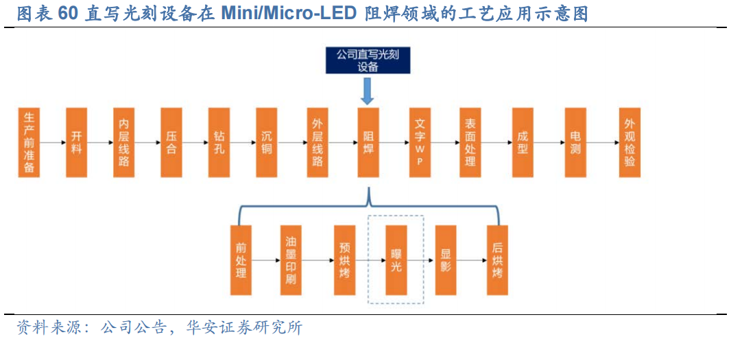 大尺寸趋势为直写光刻技术的应用渗透提供市场机遇。Mini/Micro-LED 显示面板器件数量繁多且线间距密集,要求阻焊层曝光精度较高(50-60μm),同时需匹配高反射率的阻焊油墨使用。目前,除直写光刻技术外,采用底片曝光的传统曝光技术也有应用。随着 Mini/micro-LED领域面板尺寸的不断增大,显示效果要求不断提升,器件的数量不断增多,同时需匹配高反射率的阻焊油墨使用,传统的曝光技术无法满足阻焊层曝光精度需求,为直写光刻技术的应用渗透提供了市场机遇。