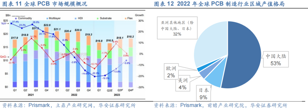 PCB 行业低谷已过,未来或为平稳增长。2023 全年 PCB 全球市场规模约为695 亿美元,相比 2022 年 817 亿美元的规模同比降低了 15%,Prismark 预测2027 年全球 PCB 约为 903 亿美元,5 年 CAGR 约为 2%。从全球制造行业区域产值格局来看,中国大陆、中国台湾、韩国及日本是全球 PCB 制造行业主要的制造基地,中国大陆占全球 PCB 市场规模的一半以上。