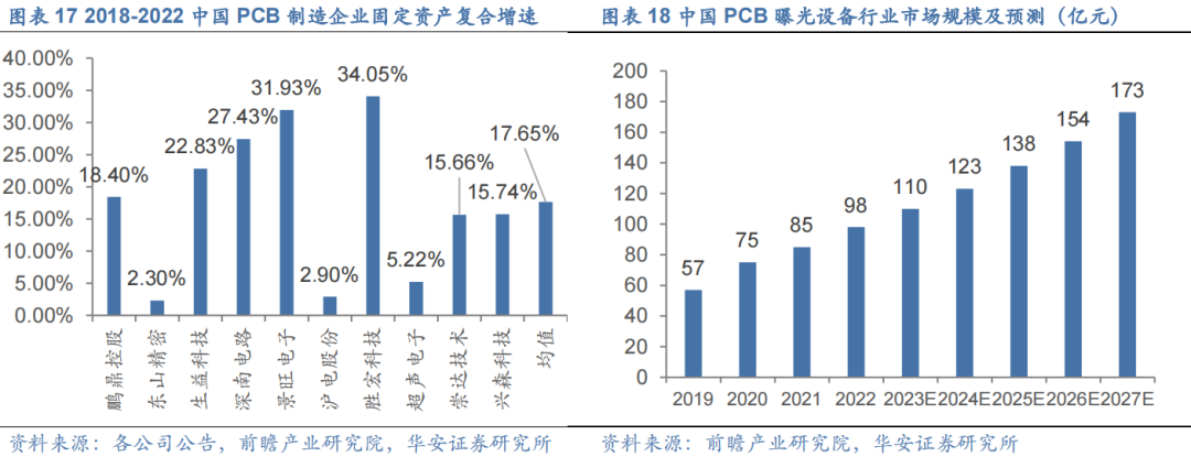 随着5G等新一代通信技术诞生并逐渐渗透,电子信息产业迎来蓬勃发展的态势,自2018年以来,绝大多数PCB制造企业纷纷扩产,2018-2022年前十大PCB制造企业固定资产平均复合增速高达17.65%。根据前瞻产业研究院数据,预计2023-2027年中国PCB曝光设备行业市场规模复合增速约12%,2027年中国PCB曝光设备行业市场规模将达到173亿元。