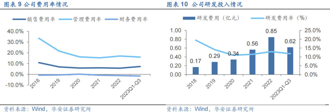 费用管控能力良好,研发投入持续加码。随着公司销售规模增长,规模效应显现,2019 年起各项费用率均呈现下降趋势,费用管控能力良好。研发投入方面,作为行业内领军企业,为保持技术领先性和应用领域的拓展,公司研发费用逐年增加,2018-2022 年 CAGR 为 49.5%,研发费用率稳定在 10%以上,截至 2023 年,上半年,公司累计已获得授权专利 148 项