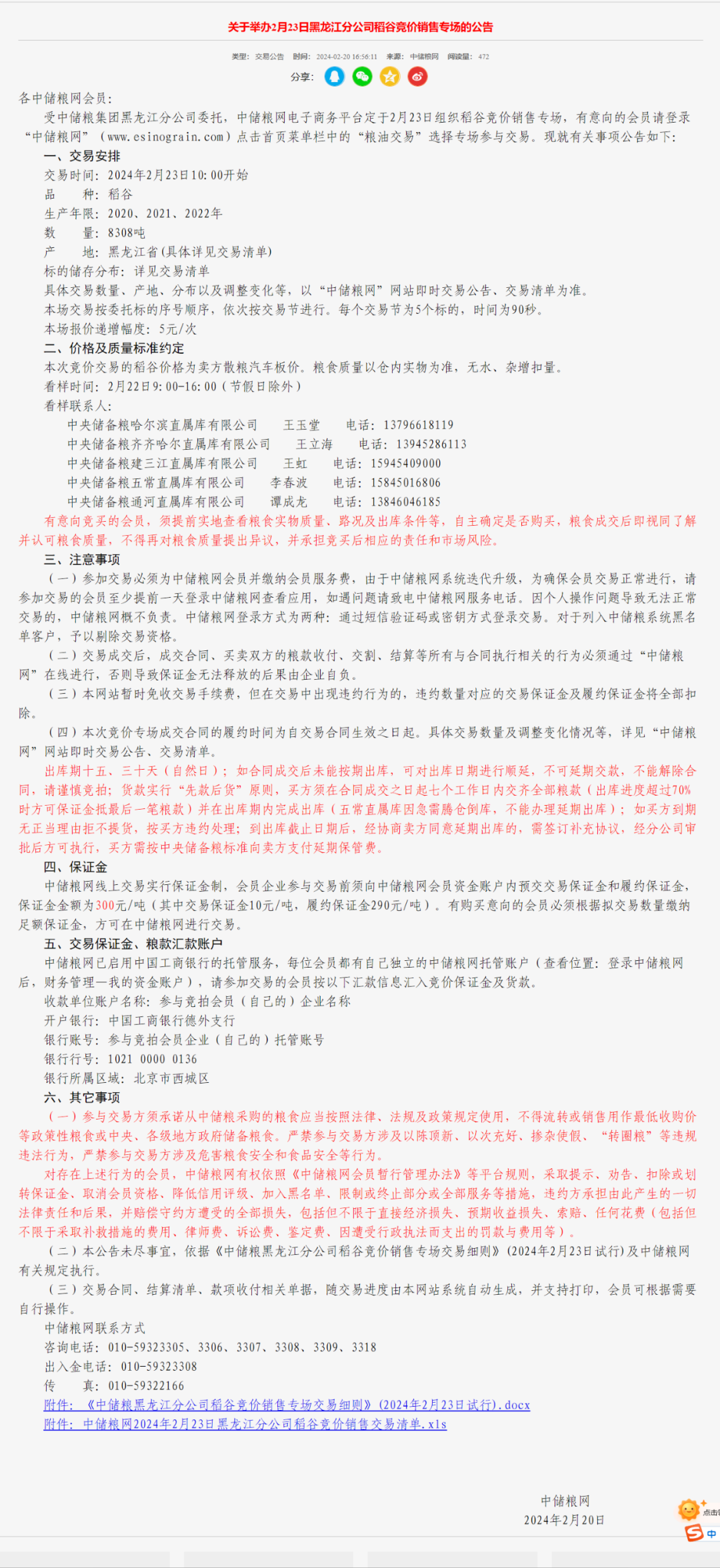 关于举办2月23日黑龙江分公司稻谷竞价销售专场的公告