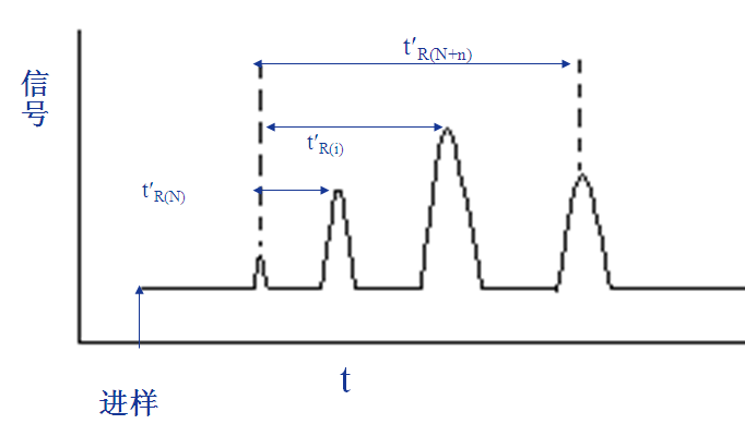 采用相对保留值是为了消除某些操作条件,如流速和固定液流失等,对保留值的影响。相对保留值中标准物可以是被测样品中的某一组分,也可以是人为加入的某一化合物。I为待测物质i在某固定液X上的保留指数,选取两个正构烷烃作为基准物质,其中一个的碳数为N,另一个为N+n,它们的调整保留时间分别为t’R(N)和 t’R(N+n),使待测物质i的调整保留时间t’R(i)恰好于两者之间,即t’R(N)<t’R(i)<t’R(N+n)。将含物质i和所选的两个正构烷烃的混合物注入其固定液X的色谱柱,在一定温度条件下绘制色谱图。