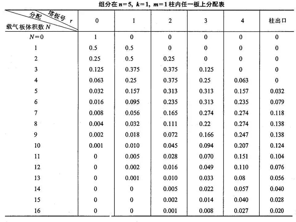 ▪ 开始时,若有单位质量,即m=1(例1mg或1μg)的某组分加到第0号塔板上,分配平衡后,由于k=1,即ns=nm故nm=ns=0.5。▪ 当一个板体积(lΔV)的载气以脉动形式进入0号板时,就将气相中含有nm部分组分的载气顶到1号板上,此时0号板液相中ns部分组分及1号板气相中的nm部分组分,将各自在两相间重新分配。故0号板上所含组分总量为0.5,其中气液两相各为0.25而1号板上所含总量同样为0.5.气液相亦各为0.25。▪ 以后每当一个新的板体积载气以脉动式进入色谱柱时,上述过程就重复一次(见下表)。