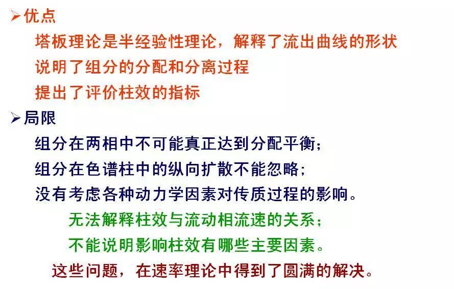 色谱分离是基于固定相对试样中各组分的吸附或溶解能力强弱的不同,而这种吸附或溶解能力的强弱可定量地用分配系数K(或容量因子k)值的大小来表示。吸附或溶解能力强的组分分配系数(或容量因子)大,保留时间长;反之,吸附或溶解能力弱的组分分配系数小,保留时间短。▪ 始于马丁(Martin)和辛格(Synge)提出的塔板模型。▪ 分馏塔:在塔板上多次气液平衡,按沸点不同而分离。▪ 色谱柱:组分在两相间的多次分配平衡,按分配系数不同而分离。(1)色谱柱内存在许多塔板,组分在塔板间隔(即塔板高度)内可以很快达到分配平衡。(2)流动相进入色谱柱,不是连续的而是脉动式的,即每次通过为一个塔板体积。(3)样品加在每个塔板上,样品沿色谱柱轴方向的扩散可以忽略。(4)在所有塔板上分配系数相等,与组分的量无关。即分配系数在各塔坂上是常数。