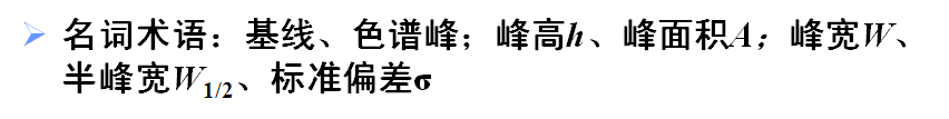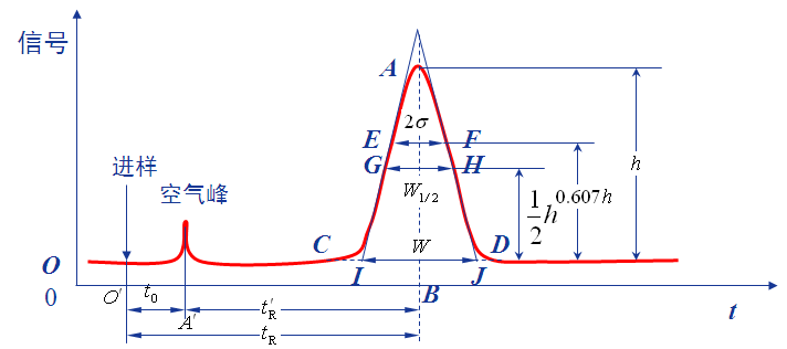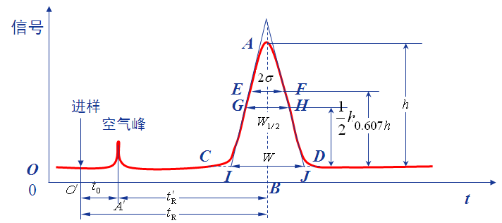 ▪ 基线:在一定色谱条件下,仅有流动相通过检测器系统时所产生的信号的曲线,称为基线,如图中ot线。实验条件稳定时,基线是一条平行于横轴的线;基线反映仪器(主要是检测器)的噪声随时间的变化。▪ 峰高:色谱峰顶点与基线之间的垂直距离,以h表示,如图AB’线。▪区域宽度:色谱峰的区域宽度直接与分离效率有关。描述色谱峰宽的方法有三种:标准偏差σ、峰宽W、半峰宽W1/2。▪标准偏差(σ):σ为正态分布曲线上两拐点间距离之半,σ值的大小表示组分离开色谱柱的分散程度。σ值越大,流出的组分越分散,分离效果变差;反之,流出组分集中,分离效果好。▪ 峰宽W:通过色谱峰两侧的拐点作切线,在基线上的截距称为峰宽,或称基线宽度,也可用W表示,如图IJ 的距离。根据正态分布的原理 ,可证得峰宽和标准差的关系是W=4σ。▪ 半峰宽W1/2:峰高一半处的峰宽称为半峰宽,如图 GH 的距离。W1/2=2.355σ,W=1.699W1/2。W1/2、W都是由σ派生而来的,除用它们衡量柱效外,还用于计算峰面积。半峰宽测量较方便,最为常用。是用来描述样品组分在色谱柱中保留程度的参数,并作为色谱定性的指标。其表示方法有: