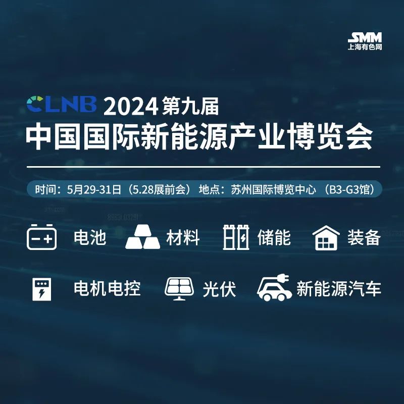 2024年5月29日-31日,CLNB 2024(第九届)中国国际新能源产业博览会将在苏州国际博览中心隆重举行。大会由SMM上海有色网主办,以为“智启双碳 绿动未来”为主题,集“会议、展览、赛事、活动”于一体,将举办主论坛开幕式、企业家沙龙、专业学术论坛等系列活动。大会聚焦新能源全产业链,围绕行业发展,技术创新,储能应用,新能源汽车、关键矿产等多个领域,集中展示锂电,钠电,储能应用,氢能及燃料电池,新能源材料,高端智能装备、新能源汽车等。届时,展会将覆盖8大展馆,1200多家国内外参展商将集中亮相。