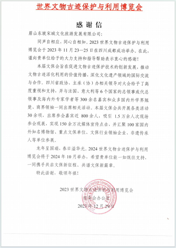 近日,世界文物古迹保护与利用博览会向眉山东坡宋城文化旅游发展有限公司发来感谢信,感谢我公司在2023年11月23日—25日举行的2023世界文物古迹保护与利用博览会活动中给予的大力支持。
