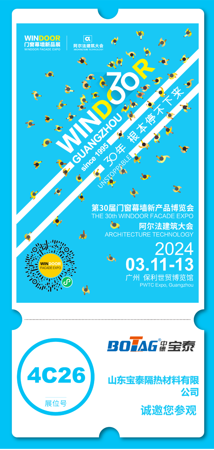 如今,虽然江西展会已经落幕,但宝泰隔热条的精彩并未结束。2024年3月11日至13日,广州保利世贸博览馆将迎来一场盛大的门窗幕墙行业盛会——第30届门窗幕墙新产品博览会。作为行业的重要盛事,这场展会将汇聚众多知名品牌和精英人士,共同探讨门窗幕墙行业的发展趋势和创新方向。